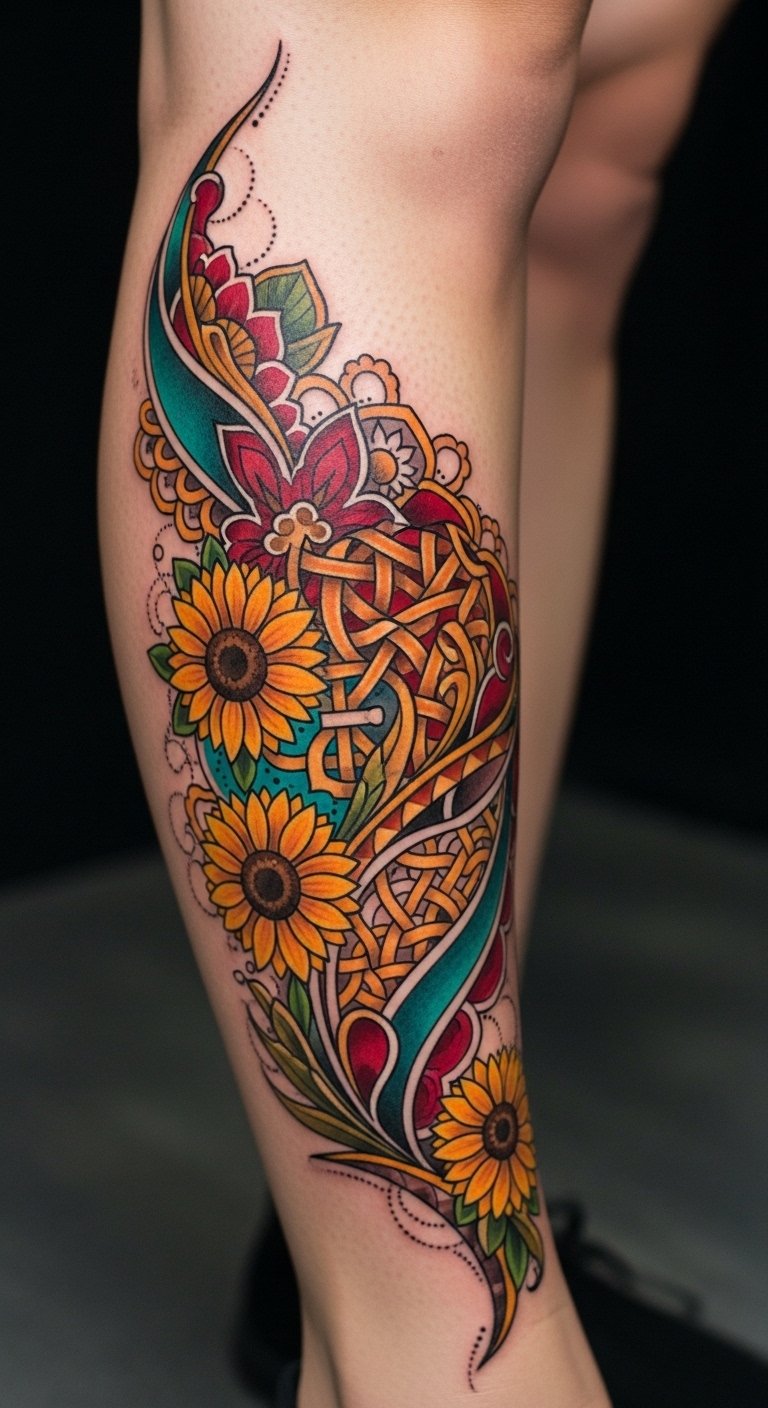A shin tattoo like this blends personal symbolism and contemporary emotion—flowers representing growth and individuality, geometric elements signaling structure and balance—creating a visual narrative of freedom and creativity along the leg.