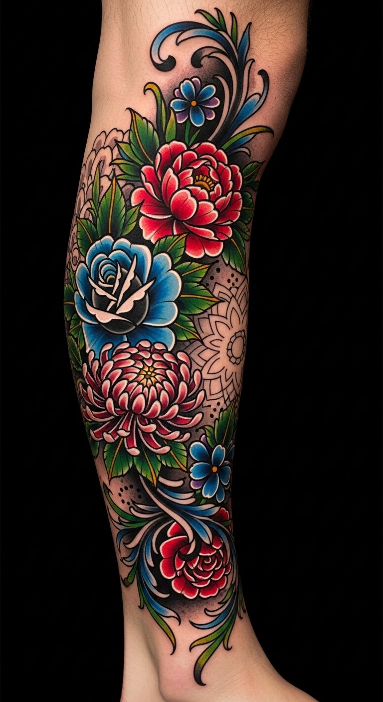 The composition merges the warmth of folk mandala motifs with neotraditional florals to evoke resilience, renewal, and personal liberation; placed spiraling along the shin and calf, it flows with muscle lines to create movement and visibility whether clothed or barefoot, offering an emotional anchor and wearable art that reads from a distance yet rewards close viewing.