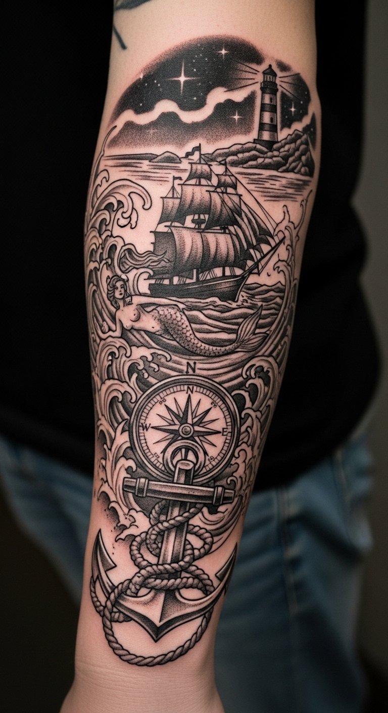This design combines elements from the original text to symbolize guidance, stability, exploration, and mythic longing; the anchor and knot ground the wearer, the compass rose and ship point toward journey and direction, the mermaid evokes mystery and allure, and the lighthouse signifies safety amid adversity.