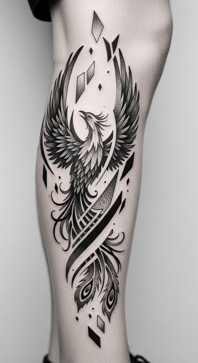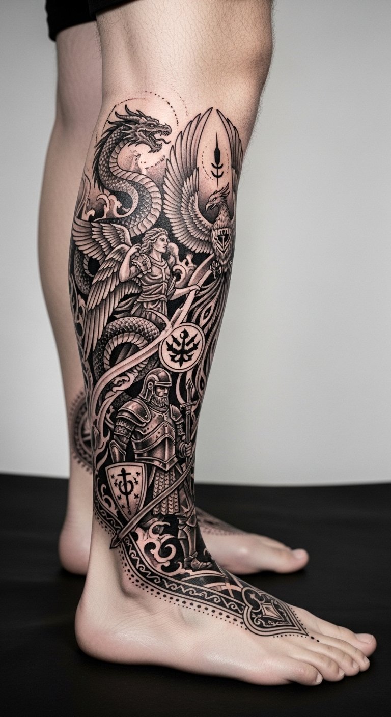 The placement on the lower shin follows natural anatomy to create upward motion and visibility, evoking protection, rebirth, and transcendence; fine details and negative space let emotions shift from fierce power at the ankle to serene ascension toward the calf.
