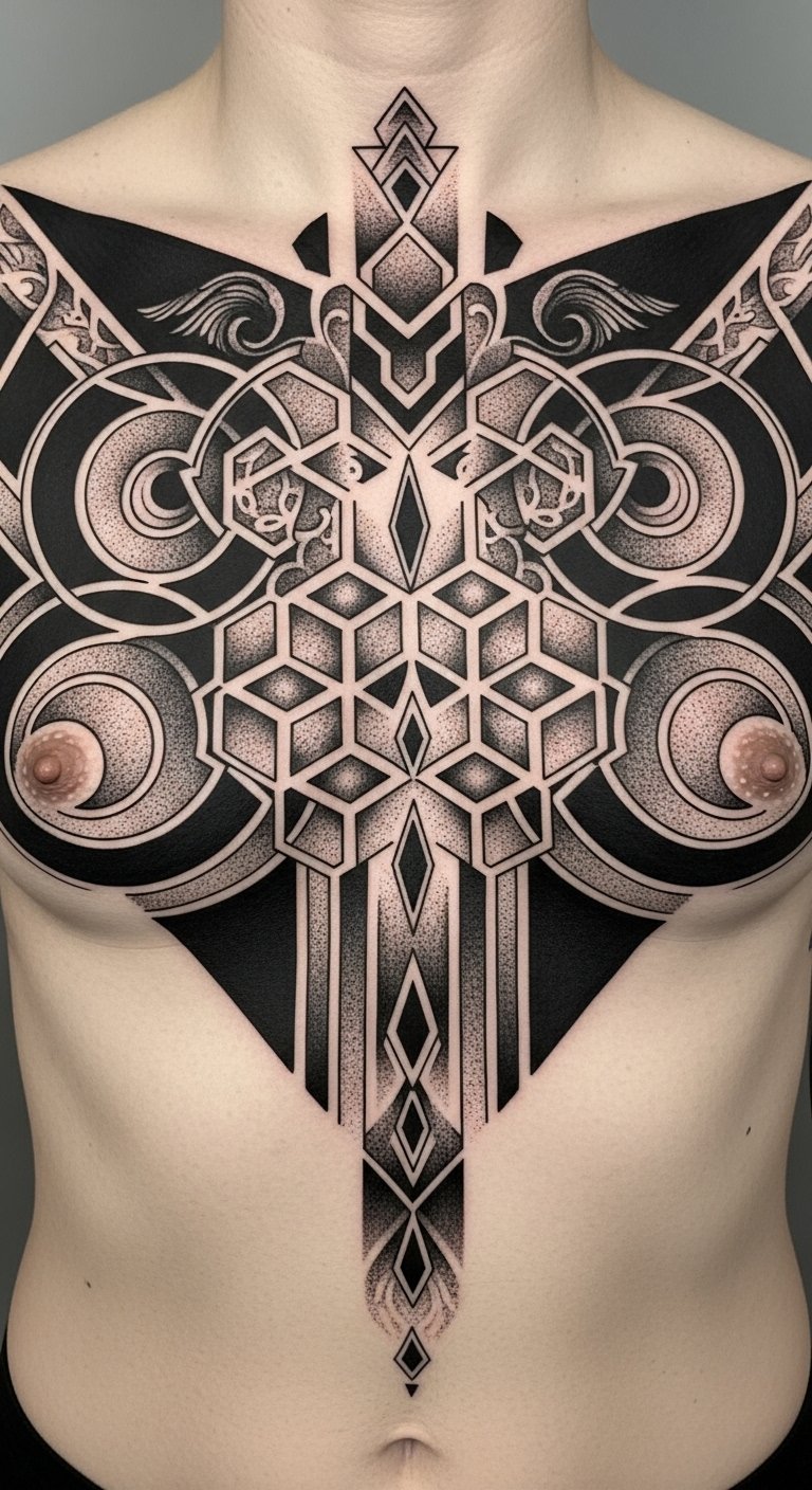 Shifting from the striking allure of bold statement blackwork, geometric symmetry in tattoos offers a fascinating exploration of balance and harmony.