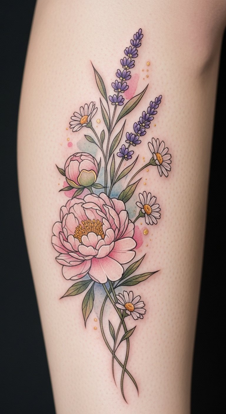 This neotraditional style beautifully blends bold lines with rich colors, celebrating floral symbolism that speaks to freedom and growth.