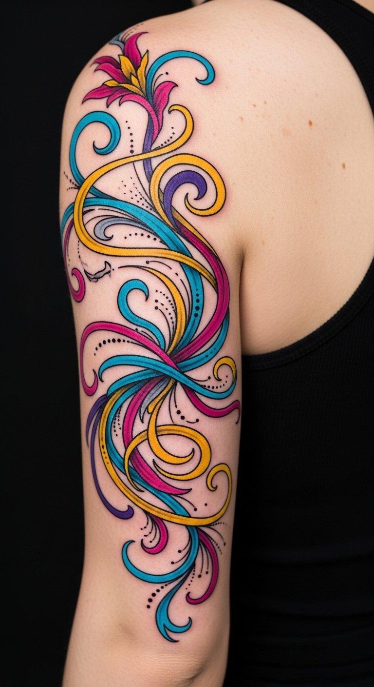 Imagine vivid designs dancing across your skin, expressing your unique essence and celebrating your freedom—each tattoo a vibrant story waiting to be told. This design symbolizes liberation and personal expression—the flowing ribbons represent life’s currents and choices, the floral elements signify growth and renewal, and the bright palette evokes joy and confidence.