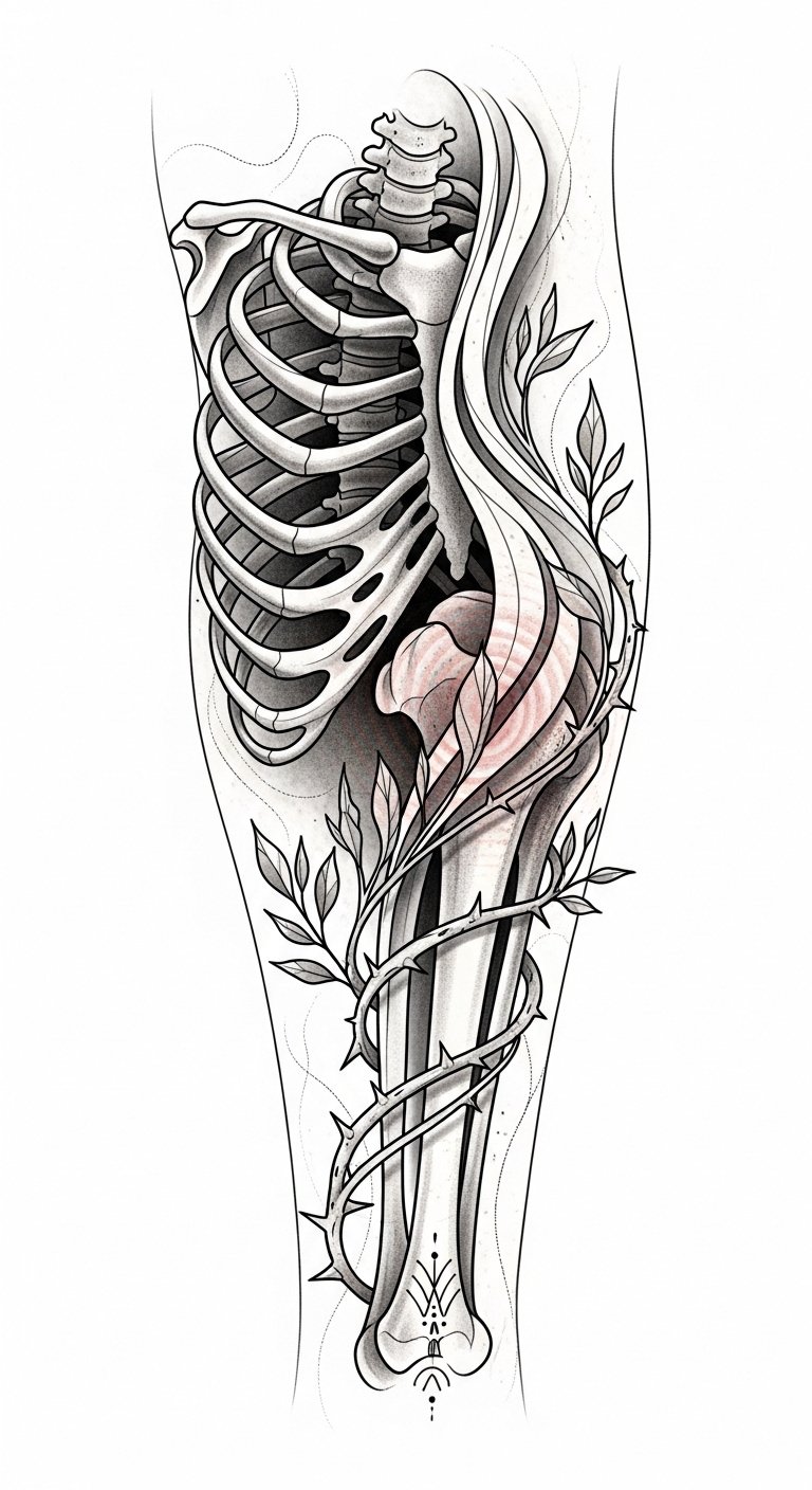 Tattooing the shin presents unique challenges that can test both the artist’s skill and the recipient’s pain tolerance. The skin’s sensitivity in this area can amplify discomfort, making pain management vital. You’ll need to prepare mentally and physically, ensuring you’re ready to embrace the experience. Trust your artist’s expertise, and remember, the stunning result will be worth maneuvering through the challenges! The design symbolizes resilience and vulnerability: the rib cage represents the protective structure of the body while the blooming vines and thorns reflect growth through pain. Emotionally it conveys strength, acceptance, and transformation; placement along the shin emphasizes vertical perseverance, with negative space and filigree guiding the eye around sensitive contours to balance aesthetics and comfort.
