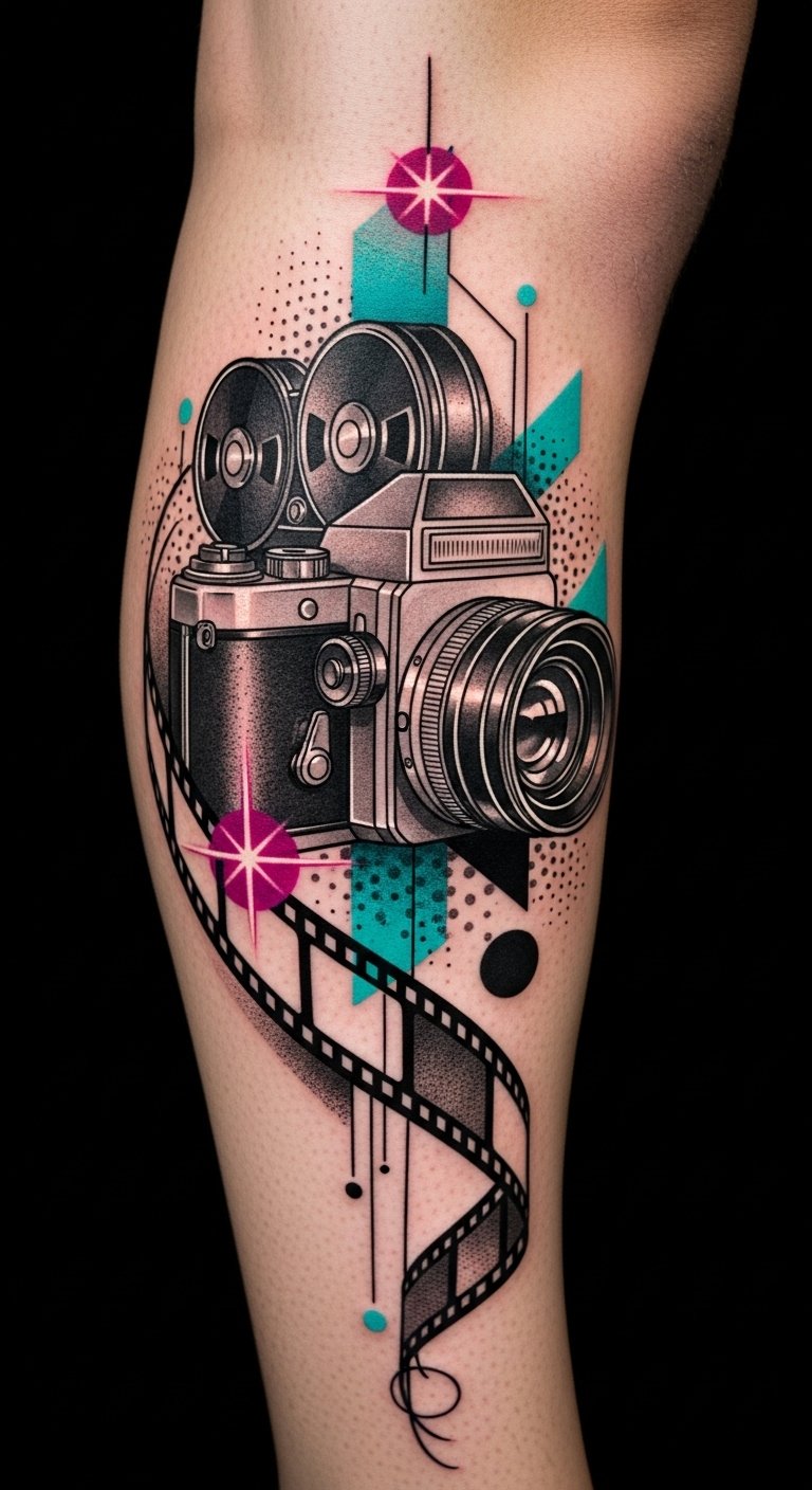 Whether you’re drawn to bold imagery or subtle nods to your favorite shows, these tattoos can express your individuality, allowing you to embrace freedom and creativity in every inked detail. The design uses the film camera and neon accents to symbolize storytelling, memory, and the interplay between personal narrative and shared cultural moments; emotionally it evokes nostalgia, energy, and a confident self-expression.