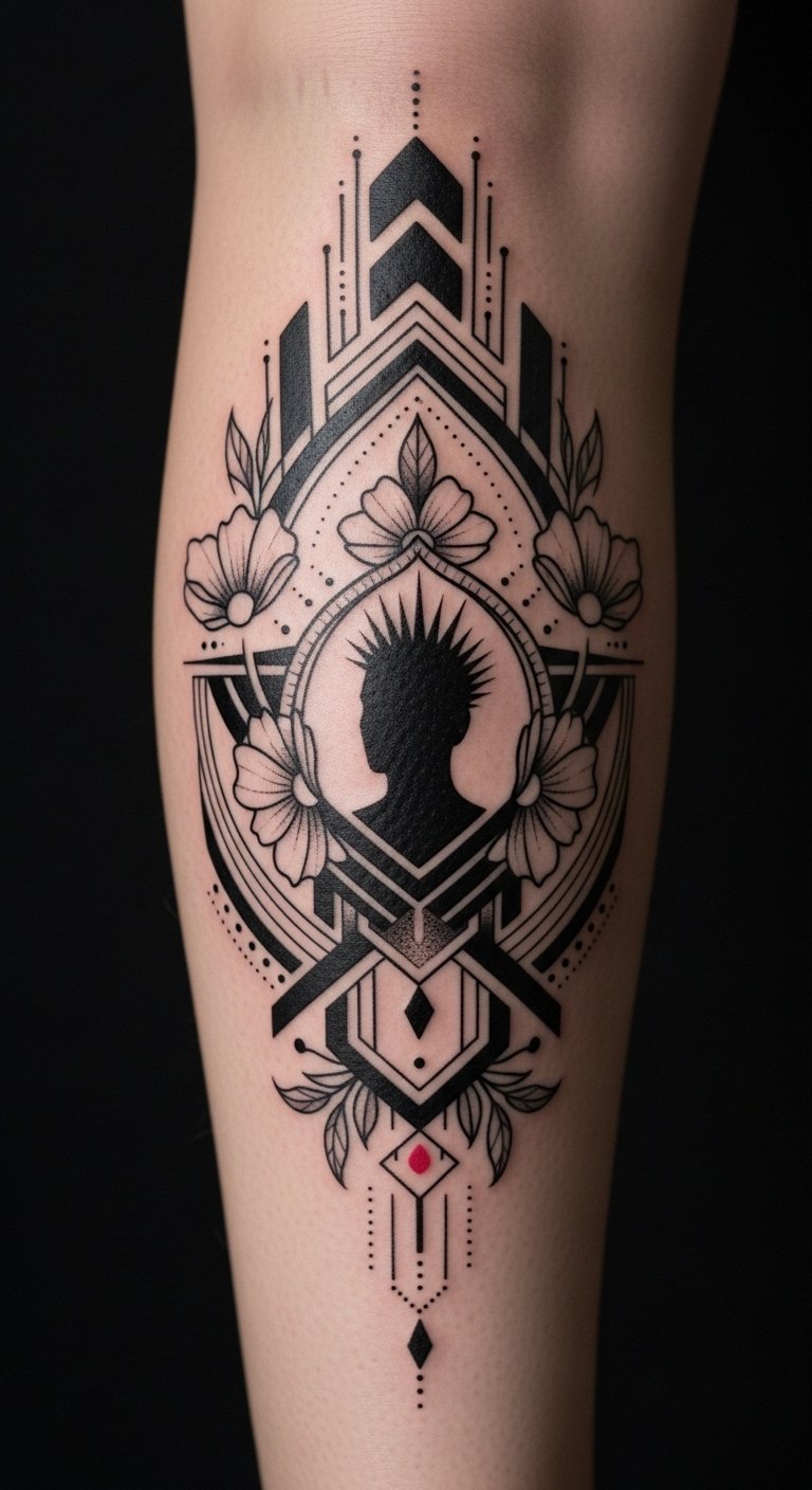 Stars like Rihanna and Travis Barker showcase unique styles that encourage you to express your individuality, turning your shin into a canvas of tattoo inspirations. The design concept blends strength and softness—geometric lines symbolize structure and resilience while the floral elements add growth and vulnerability; the central silhouette nods to celebrity influence, anchoring personal identity.