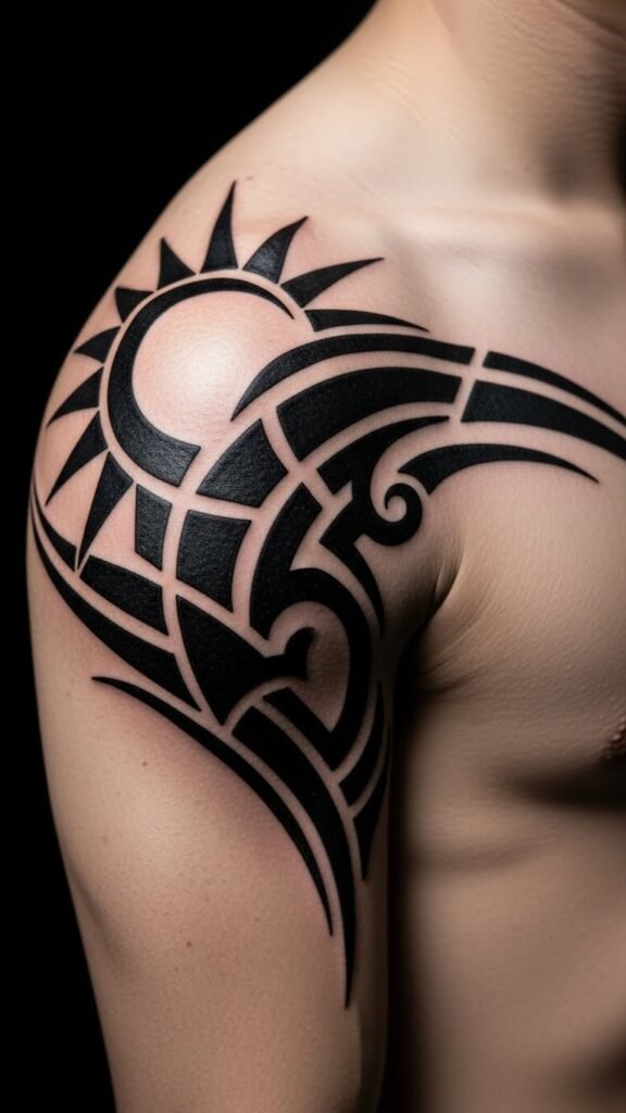 Embrace the freedom in expressing who you’re through these powerful, striking designs. The sun-and-wave composition symbolizes resilience and adaptability—sun for vitality and leadership, wave for movement and emotional depth—evoking confidence and calm; placed over the deltoid it follows natural muscle curves so the piece reads dynamically in motion, visible in sleeveless wear yet easily covered, inviting personal connection and cultural respect.