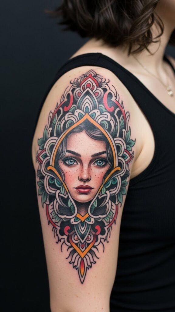 Emotionally it evokes wistful empowerment and proud individuality; placement on the shoulder emphasizes bearing one’s history with strength while allowing the imagery to flow naturally with body contours, making it both intimate and expressive.