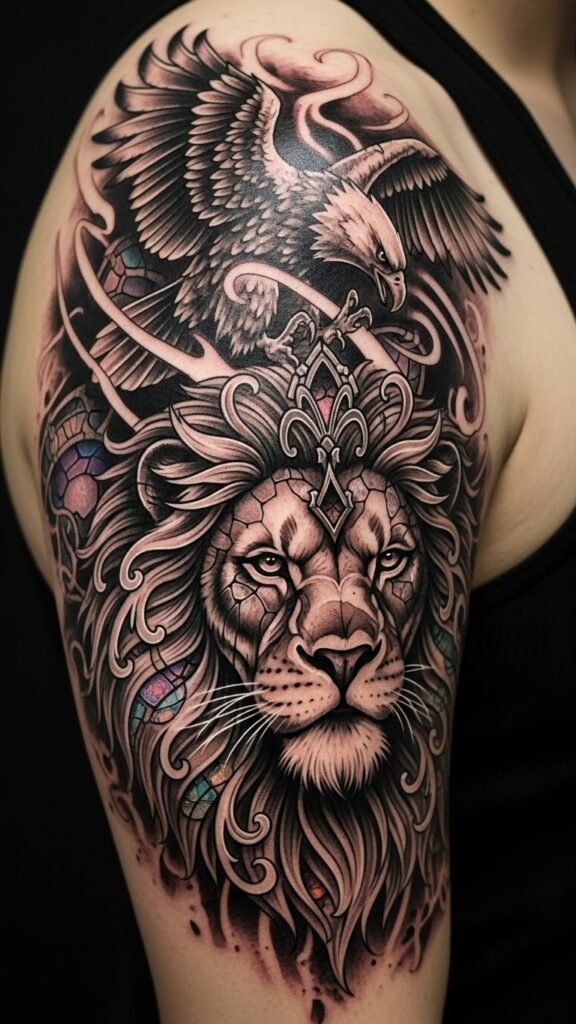 The composition places the lion’s face centered over the deltoid with the eagle’s wings arching toward the clavicle and upper back, evoking protection and ascent; the gothic filigree and stained-glass textures add solemnity and timeless emotion, while black-and-gray shading emphasizes resilience and inner courage.