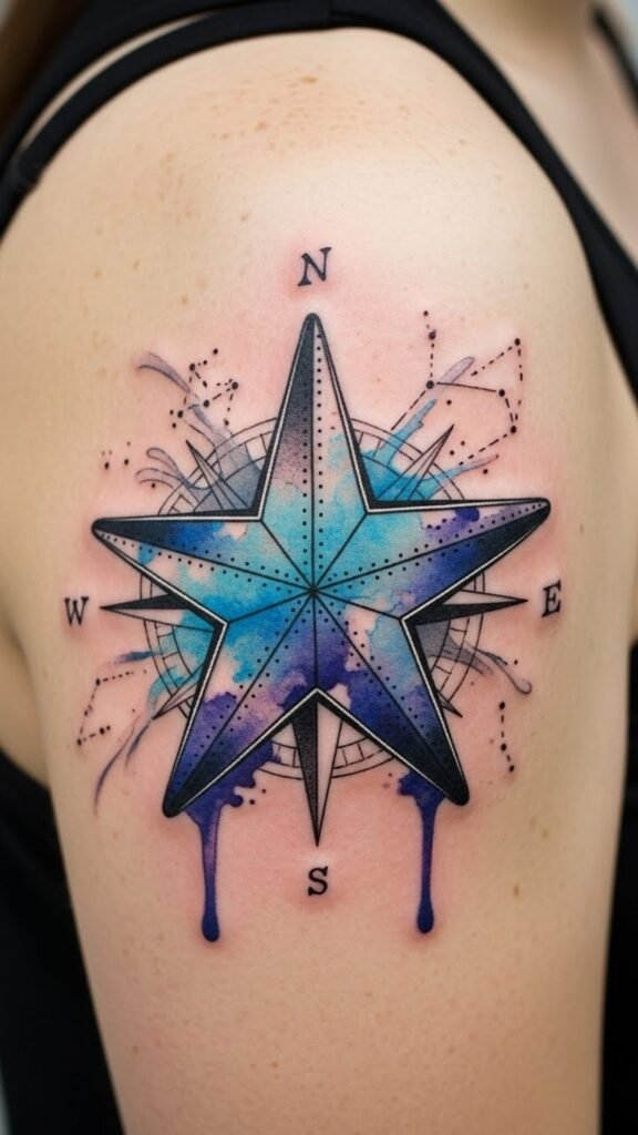 A nautical star tattoo on your shoulder can embody your journey toward self-discovery and endless possibilities.