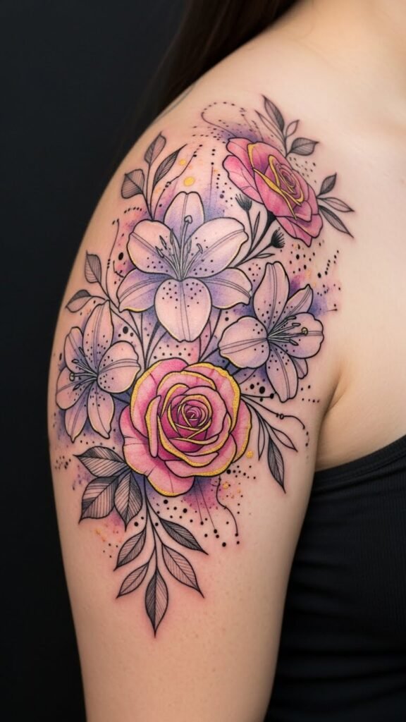 The chosen placement follows the shoulder’s natural curve, the stems and tendrils wrapping toward the collarbone and upper arm to create movement and flow; roses symbolize love and passion, lilies suggest purity and renewal, and wildflowers evoke freedom and resilience—together they convey an emotional narrative of growth and enduring beauty, suitable for someone who wishes to carry those meanings visibly yet gracefully.