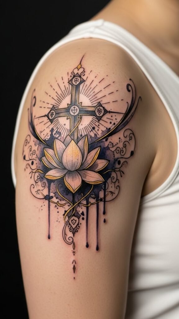 These faith symbols, like the cross or lotus flower, embody divine guidance and resilience.