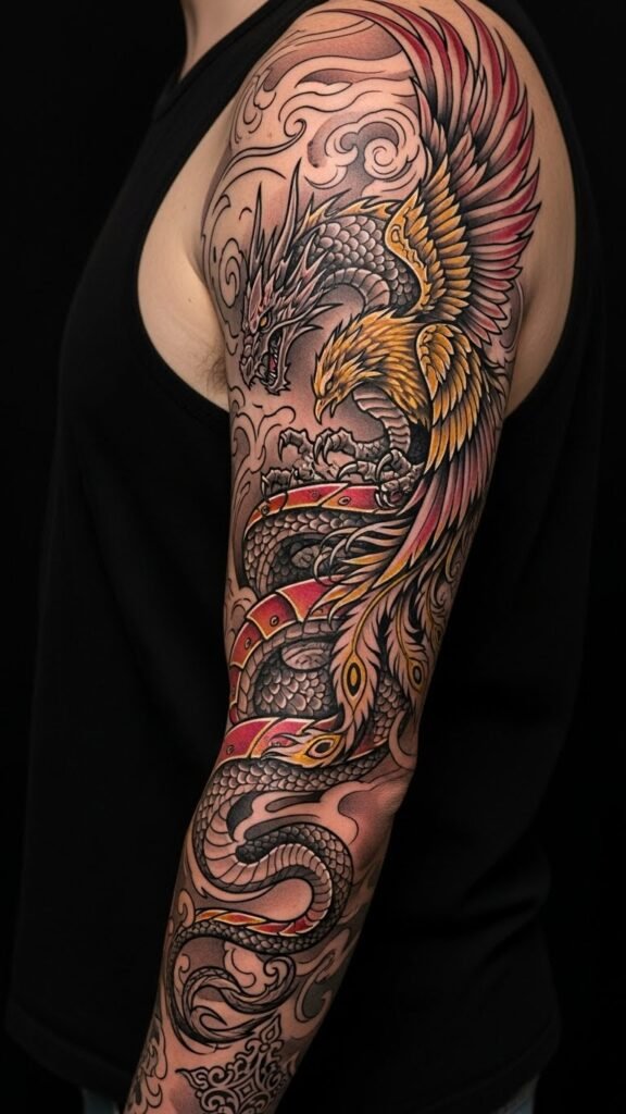 This design pairs the dragon’s protective strength and the phoenix’s rebirth to symbolize resilience and continual growth; the intertwining forms create movement and emotional intensity, suited for a full sleeve that follows the arm’s natural lines—shoulder placement for dominance, forearm for personal meaning, with negative-space highlights where skin tone can emphasize renewal and light.