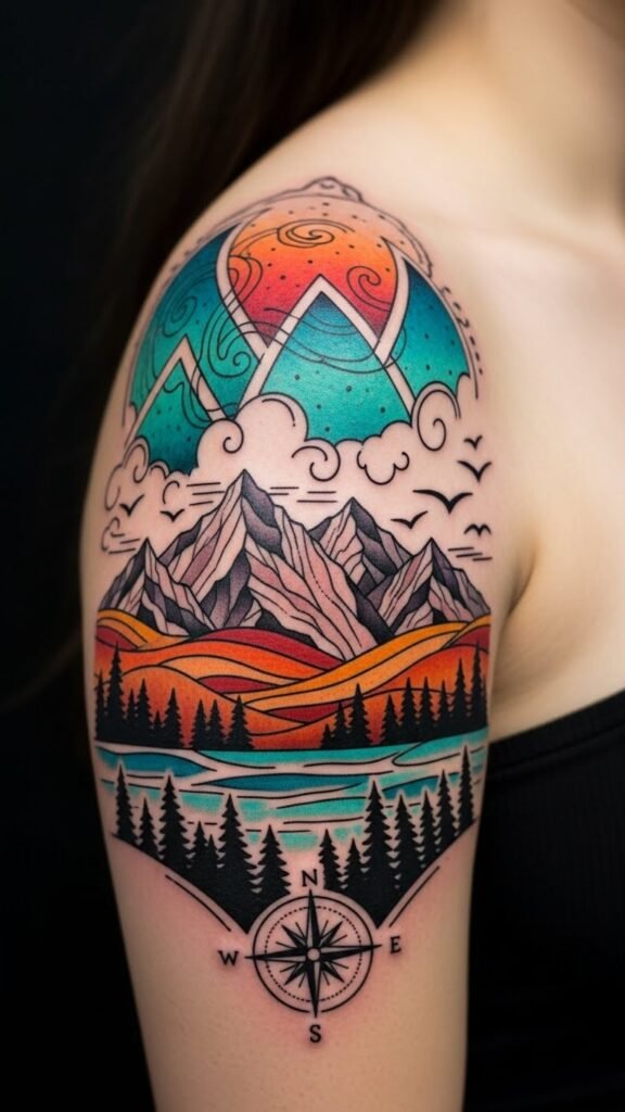 This design blends symbolic motifs to evoke freedom, adventure, and a deep connection to the natural world: the geometric mountains represent resilience and aspiration, the flowing clouds suggest change and imagination, the serene forest band conveys grounding and renewal, while the compass rose and migrating birds add guidance and journey. Placed across the upper shoulder, arcing toward the clavicle and wrapping slightly onto the upper arm, the composition follows the body’s natural contours so movement animates the scene; emotionally it reads as a wearable landscape of personal storytelling, meant to inspire confidence and calm when viewed up close or at a glance.