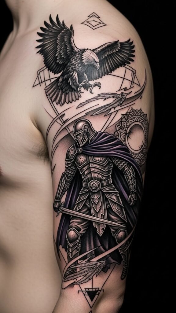 This placement emphasizes breadth and movement—wrap the warrior on the deltoid with the eagle’s wings arcing onto the upper chest and outer biceps—so the composition reads dynamically whether the arm is relaxed or flexed.