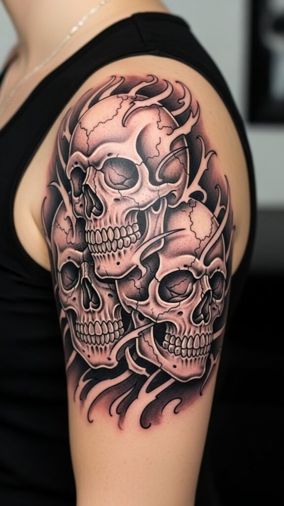 As a shoulder tattoo concept, place a stylized skull at the apex of the deltoid, its contours softened with watercolor washes and bold linework, small bursts of color radiating outward like fleeting moments; incorporate subtle floral elements and broken clock fragments merging into the skull to emphasize transience.