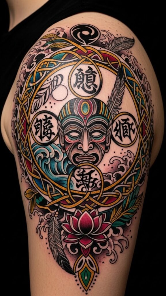 Placed on the shoulder cap and wrapping slightly toward the chest and upper arm, it reads as both an intimate personal emblem and a public celebration—honoring ancestry, fostering heritage preservation, and expressing freedom through visible, wearable storytelling.