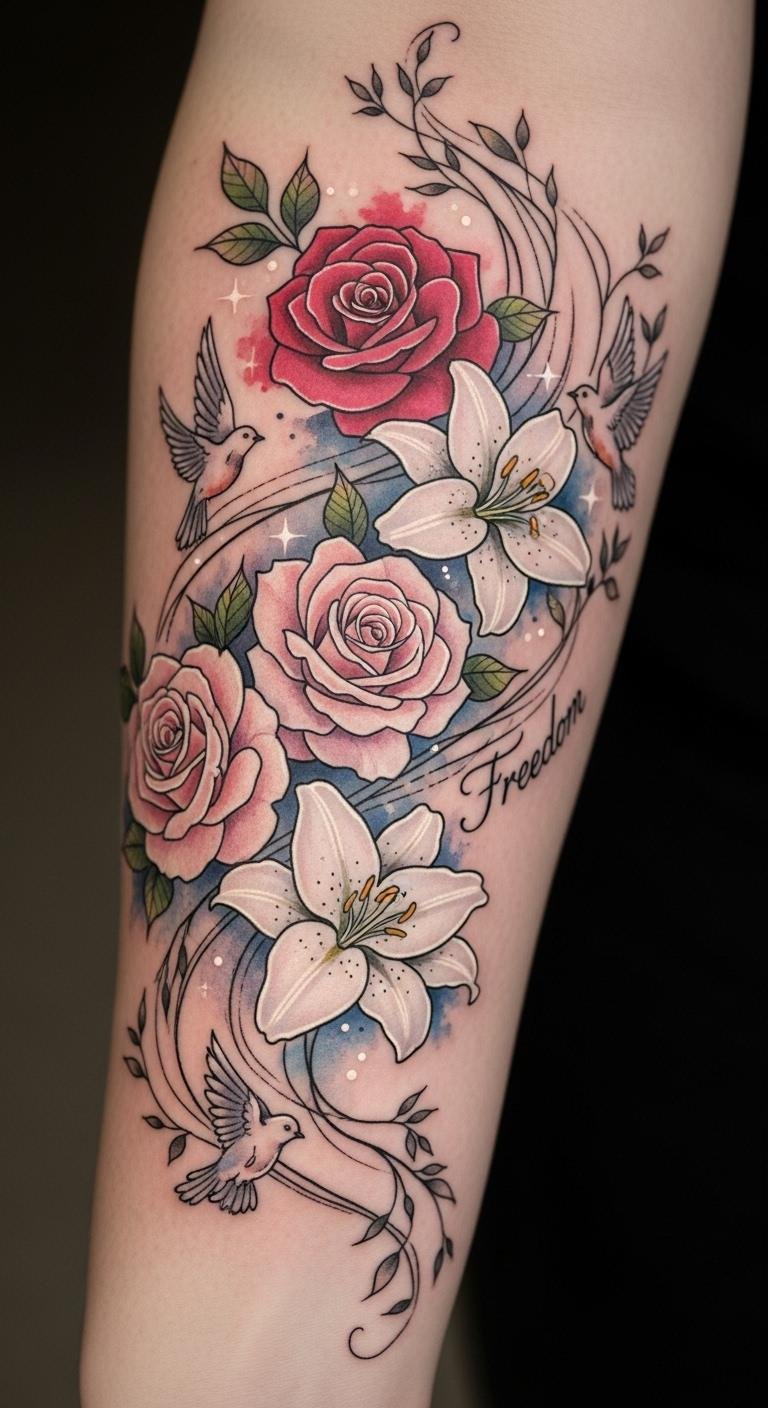 The design emphasizes symbolic layers—roses for love and resilience, lilies for purity and renewal, and small bird motifs for freedom—evoking tenderness, confidence, and personal liberation; ideal placement is along the forearm for visibility and flow or the ribcage for intimacy, both allowing the composition to move with the body and be protected from sun exposure when needed.