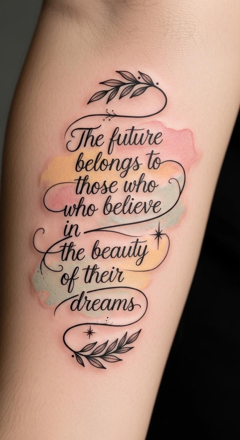 The ribbon-like cursive suggests movement and continuity, the laurel leaves symbolize victory and self-recognition, and the tiny star marks guidance—together evoking resilience and gentle empowerment; the inner forearm placement keeps it intimate yet visible for personal reminders and for sharing when desired, while the soft watercolor background adds warmth and emotional depth without overpowering the clarity of the words.