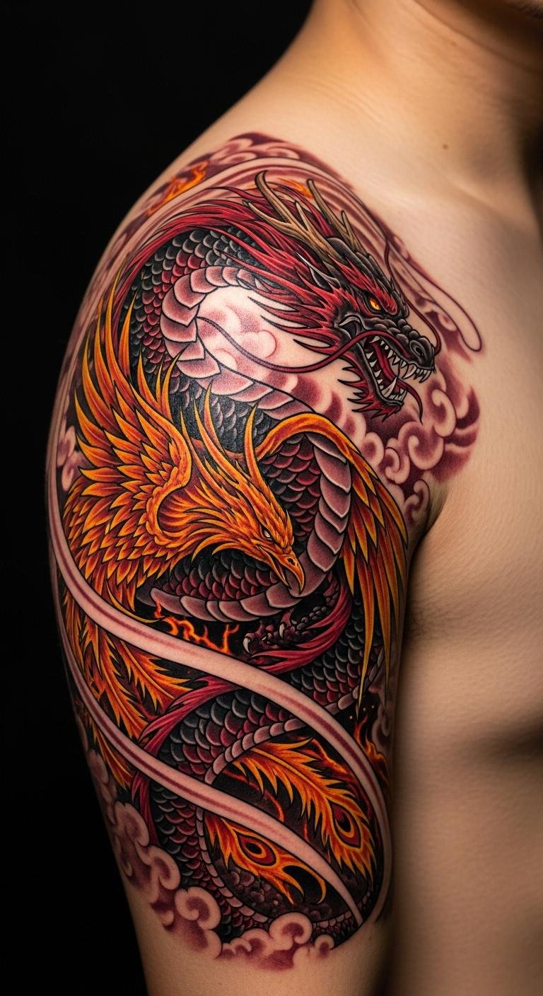 From fierce dragons to graceful phoenixes, each design offers a tale of strength and freedom, empowering you to embrace your inner warrior and ignite your bold style. The design symbolizes balance between destruction and rebirth, evoking courage, resilience, and renewal; emotionally it reads as both protective and aspirational, intended to inspire confidence.
