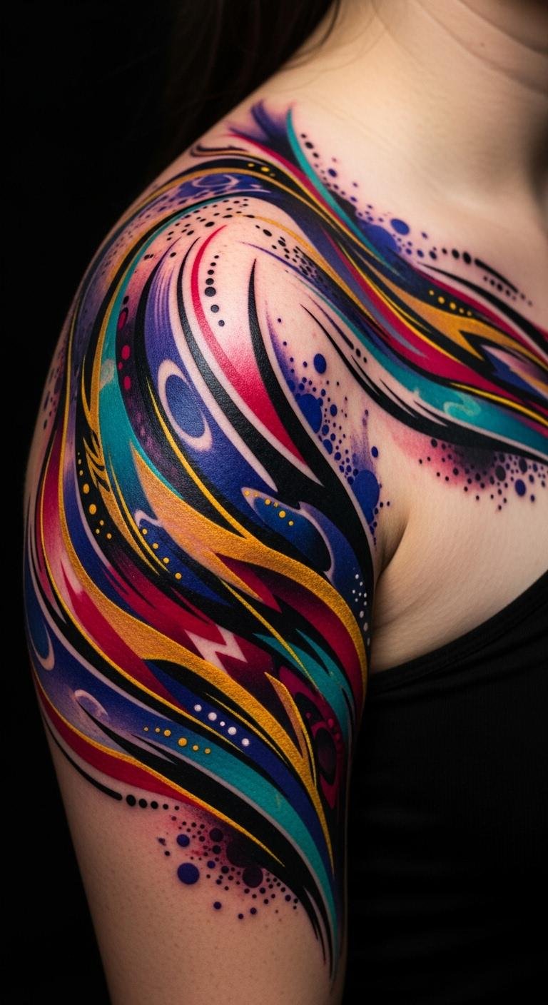 Abstract art tattoos make striking personal statements, transforming your shoulder into a canvas of self-expression.