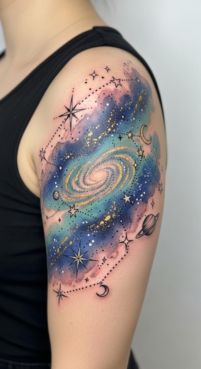 Cosmic patterns and celestial elements can transform your shoulder into a canvas of wonder. Imagine intricate constellations or shimmering galaxies, each representing your dreams and aspirations, allowing you to carry the universe’s magic wherever you go.