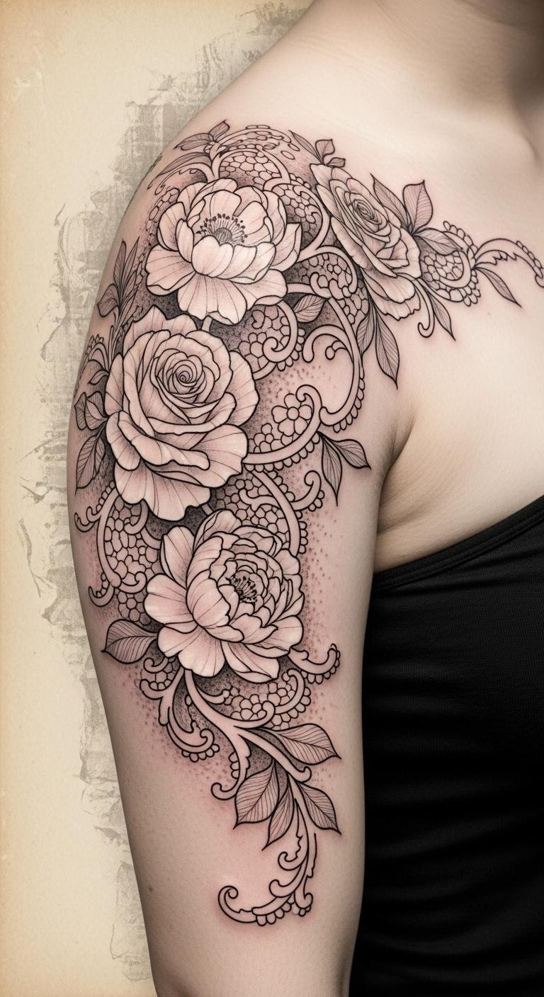 The design symbolizes a reverence for history and feminine strength, evoking nostalgia and quiet confidence; placed on the shoulder and wrapping slightly toward the upper arm, it reads as both personal adornment and visible statement, allowing the wearer to reveal or conceal the piece with clothing and movement.