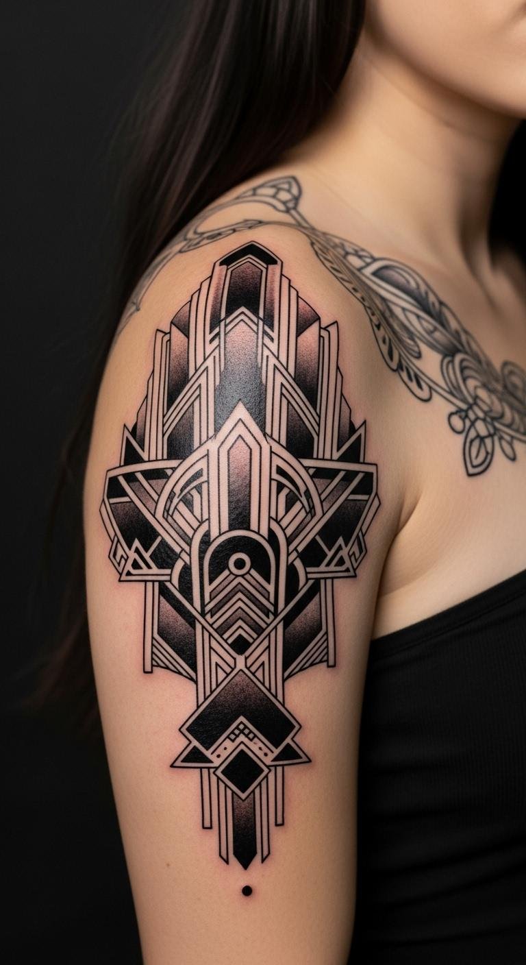 Art Deco-inspired shoulder piece combining fan-shaped geometric motifs, stepped ziggurat forms, and stylized sunbursts in strong black and gold ink, accented with fine dotwork and filigree; the composition radiates outward from the clavicle to the upper arm, integrating negative space to highlight bold lines and intricate patterns. The design symbolizes resilience and self-expression—bold lines for strength, ornate details for individuality—evoking vintage glamour and confidence; ideal placement on the shoulder allows the piece to move with the body, making a visible and empowering statement.