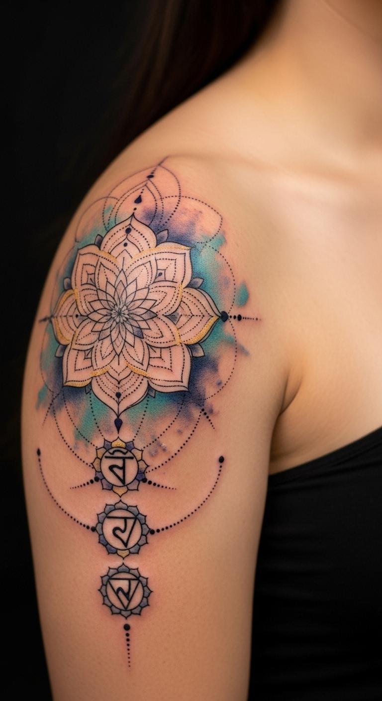 The mandala center represents unity and the self, the ascending chakra motifs suggest personal evolution and balance, and the watercolor hues evoke emotion and vitality; placed on the shoulder the piece reads as both intimate and visible, moving with the body to reflect ongoing transformation.