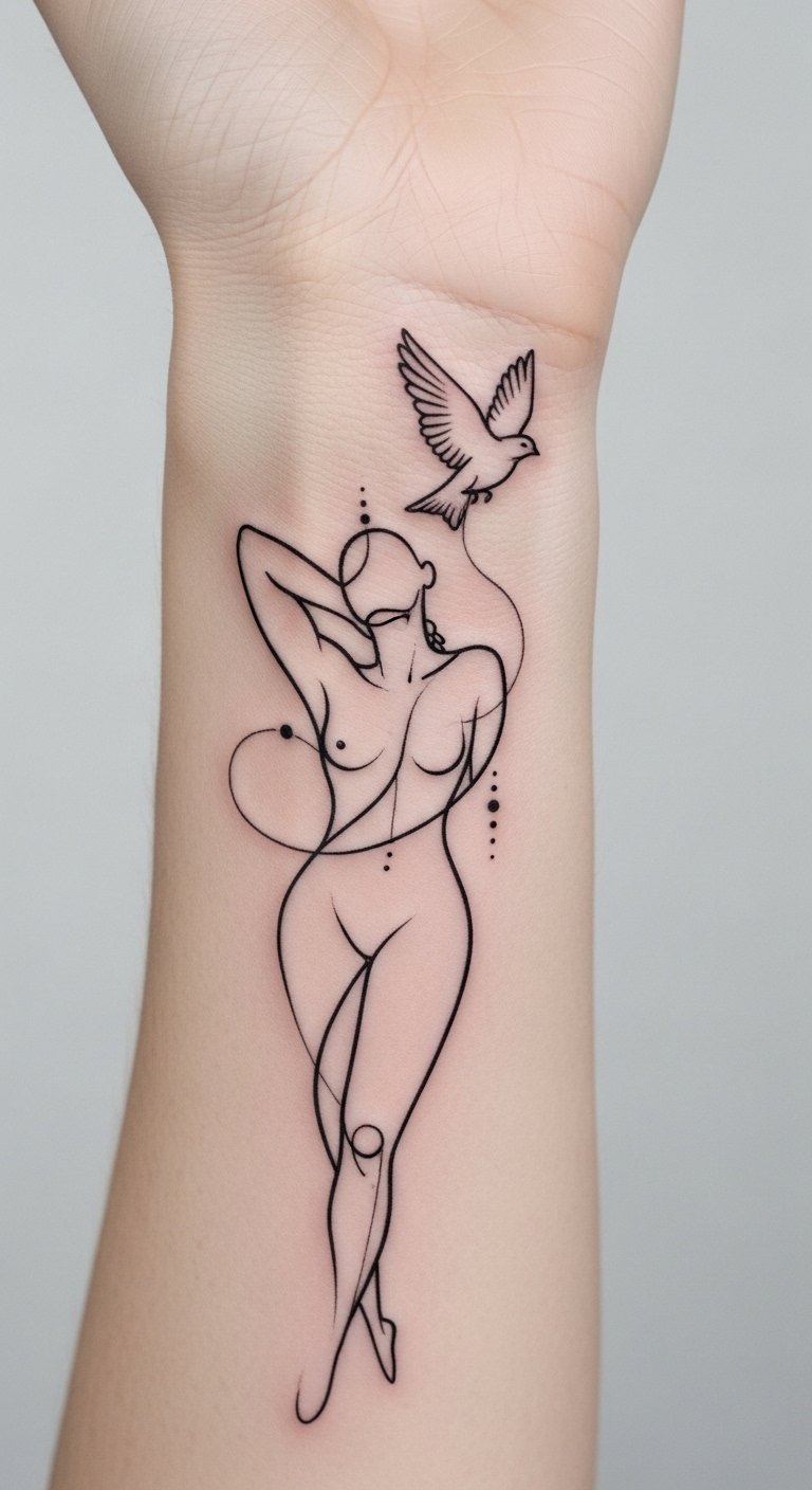 With every glance, you embrace freedom, showcasing the beauty of simplicity through stunning, intentional art. The image evokes themes of liberation and inner harmony—the bird signifies freedom and aspiration while the continuous human outline represents unity and self-discovery; placed on the wrist or behind the ear it feels intimate and conversational, inviting quiet confidence and daily reminders of simplicity and personal narrative.