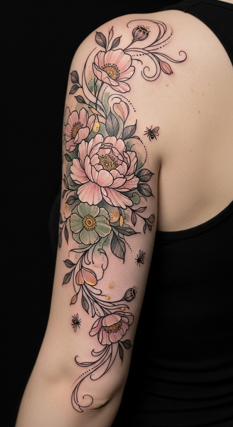 The proposed composition uses peonies and wild roses to symbolize beauty, resilience, and layered personal growth, with tiny bees and seed pods representing diligence and new beginnings; the watercolor palette evokes gentle nostalgia and warmth, while fine linework and negative space create intimacy and motion—ideal for wrapping the forearm for visibility and flow or the shoulder blade for a more private, sweeping placement that follows natural musculature.