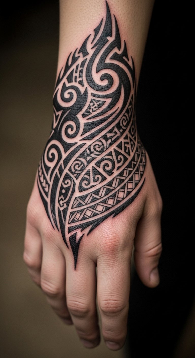 The emotional tone is reverent and contemplative, honoring ancient traditions while embracing contemporary self-expression. Intricate loops and balanced negative space create rhythm and flow across the hand’s contours, making the tattoo both an aesthetic accent and a wearable story of connection.