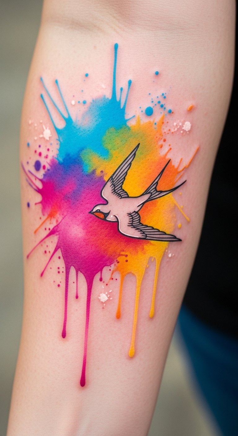 The watercolor splash tattoos text provides the visual starting point: the vibrant hues and paint-like flow frame the fine-line swallow, symbolizing freedom, hope, and personal journey. Emotionally the design balances bold creativity with graceful movement—the wash of colors evokes spontaneity and expression while the swallow adds intention and resilience. Placement on the forearm allows the colors to breathe with the arm’s contours, offering visibility for personal meaning and enough flat surface for the watercolor blending to remain vivid over time.