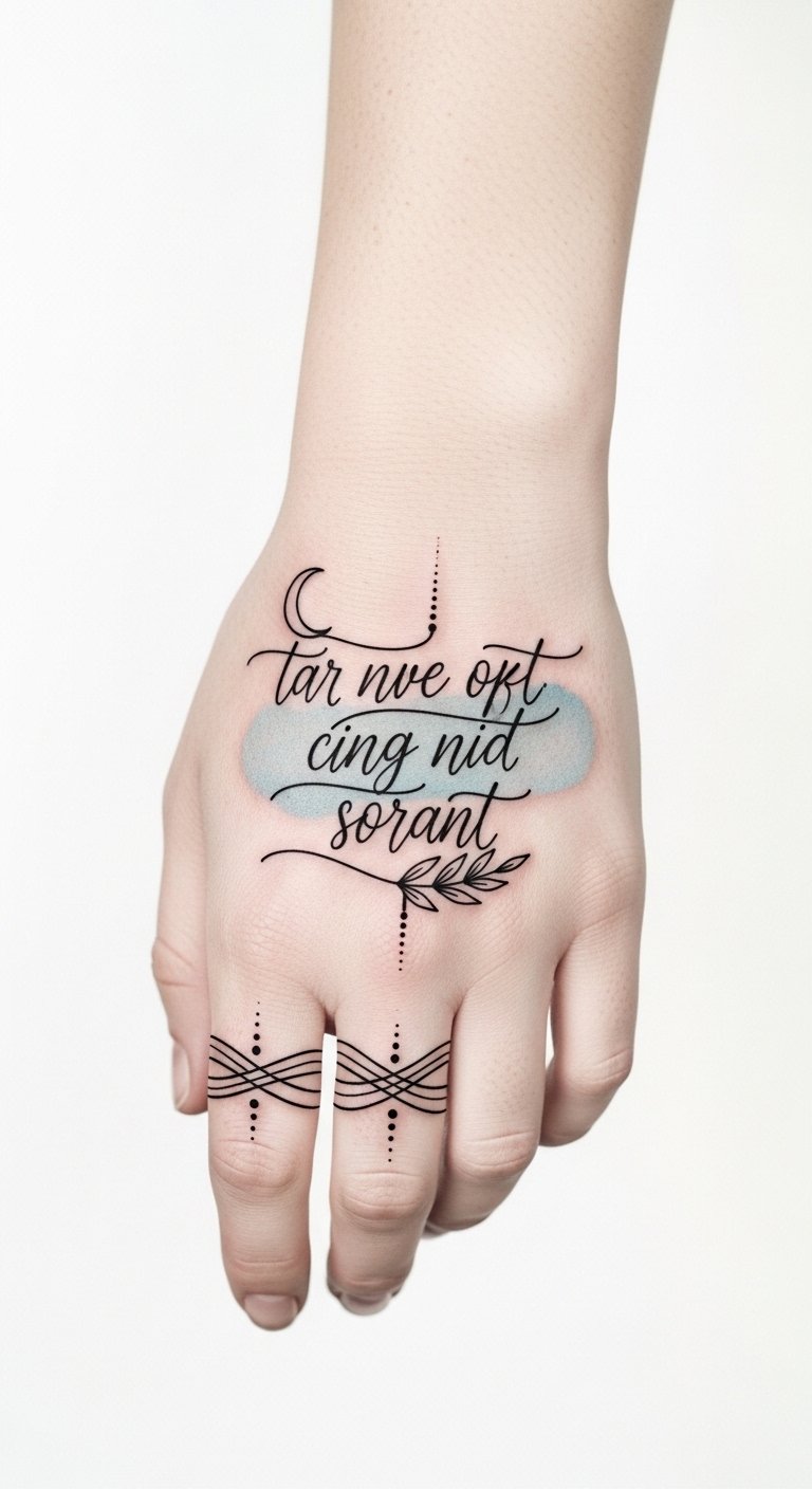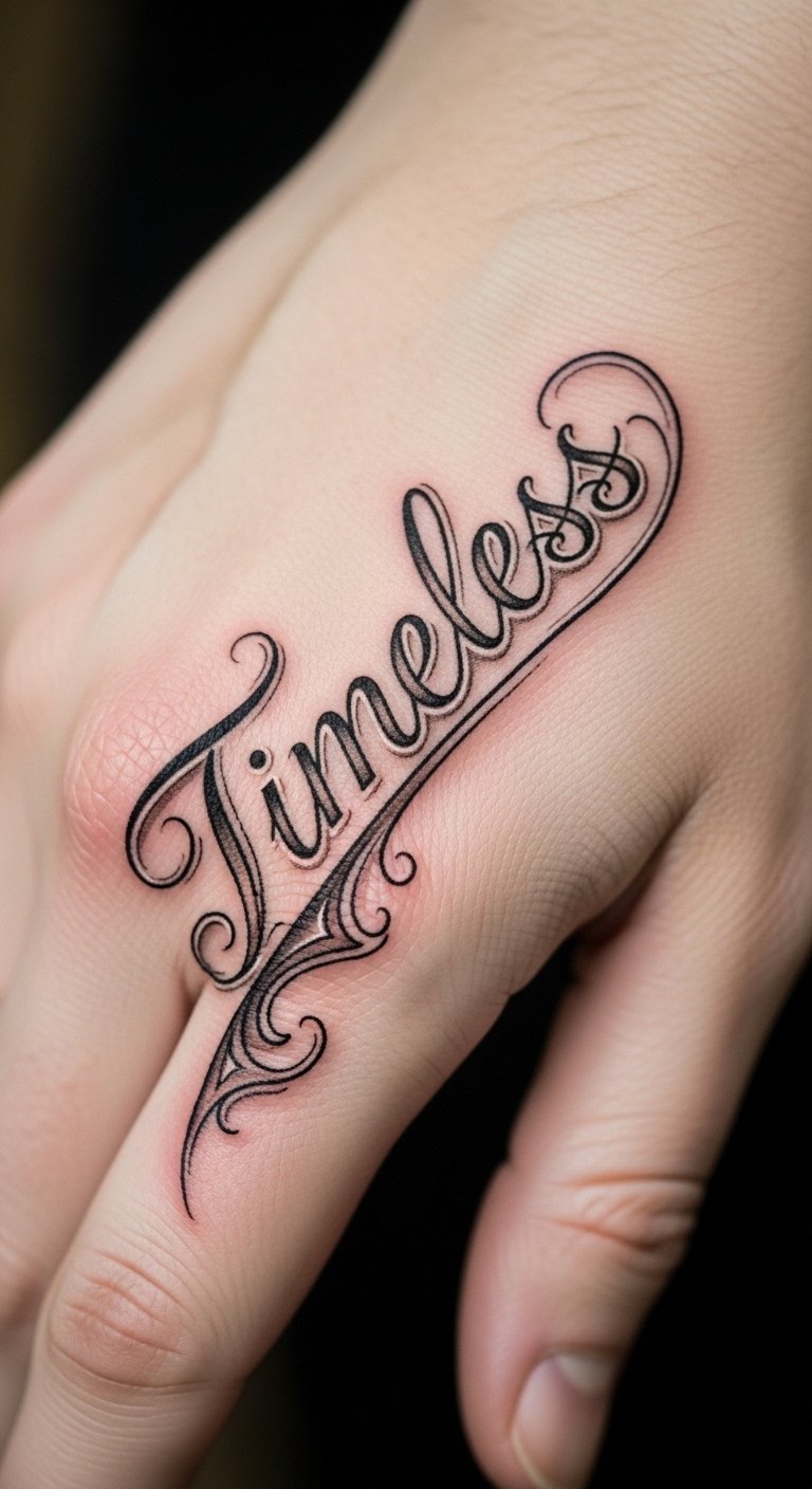 Vintage script tattoos on the side hand blend intimate visibility with delicate artistry; the flowing vintage lettering suggests a soft, nostalgic rhythm, each curve conveying personal history and quiet confidence.