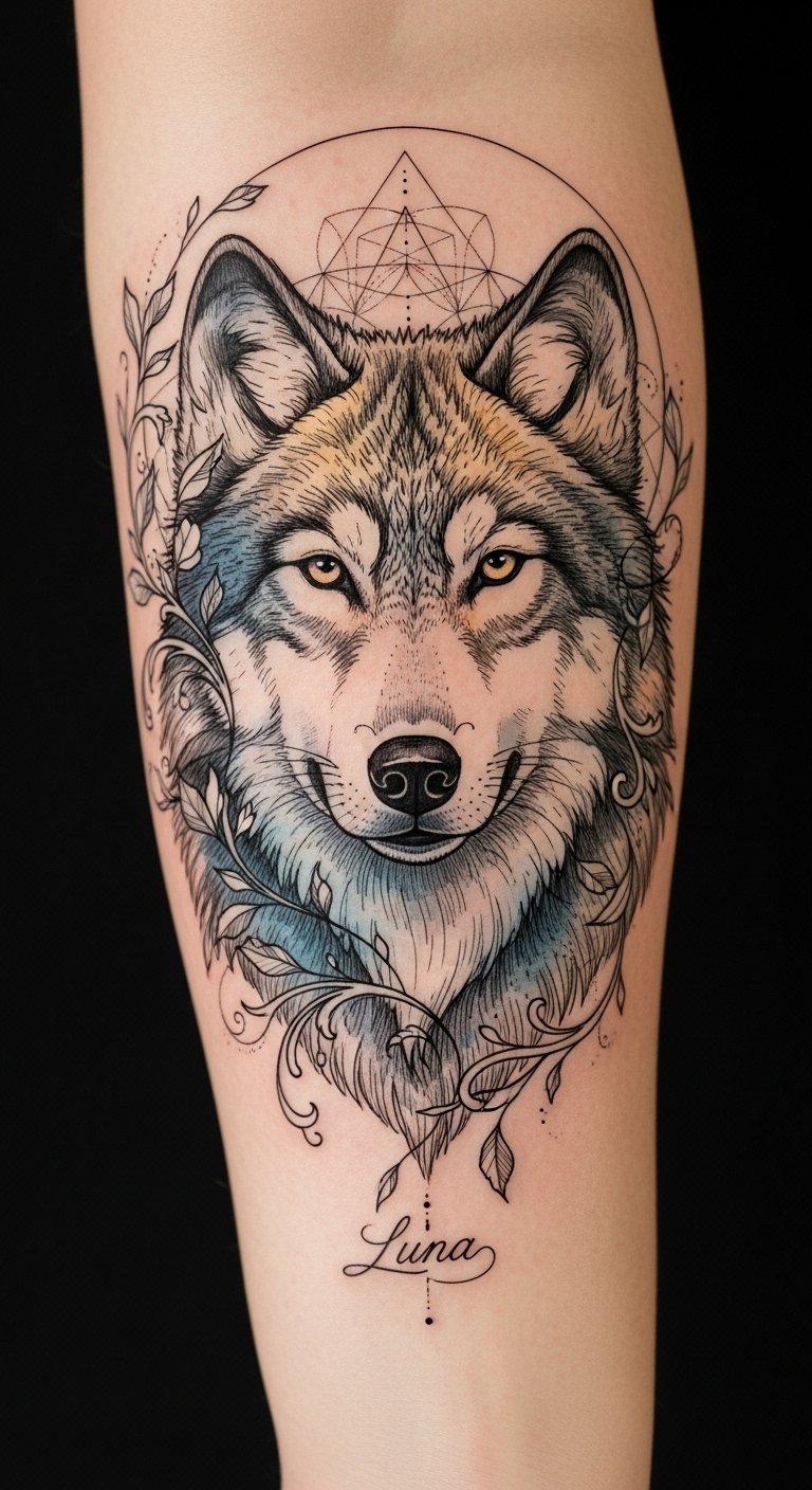This concept blends protection and loyalty (wolf) with tenderness (floral filigree) to evoke strength tempered by memory; the watercolor tones add vulnerability while the mandala halo implies spiritual guidance.