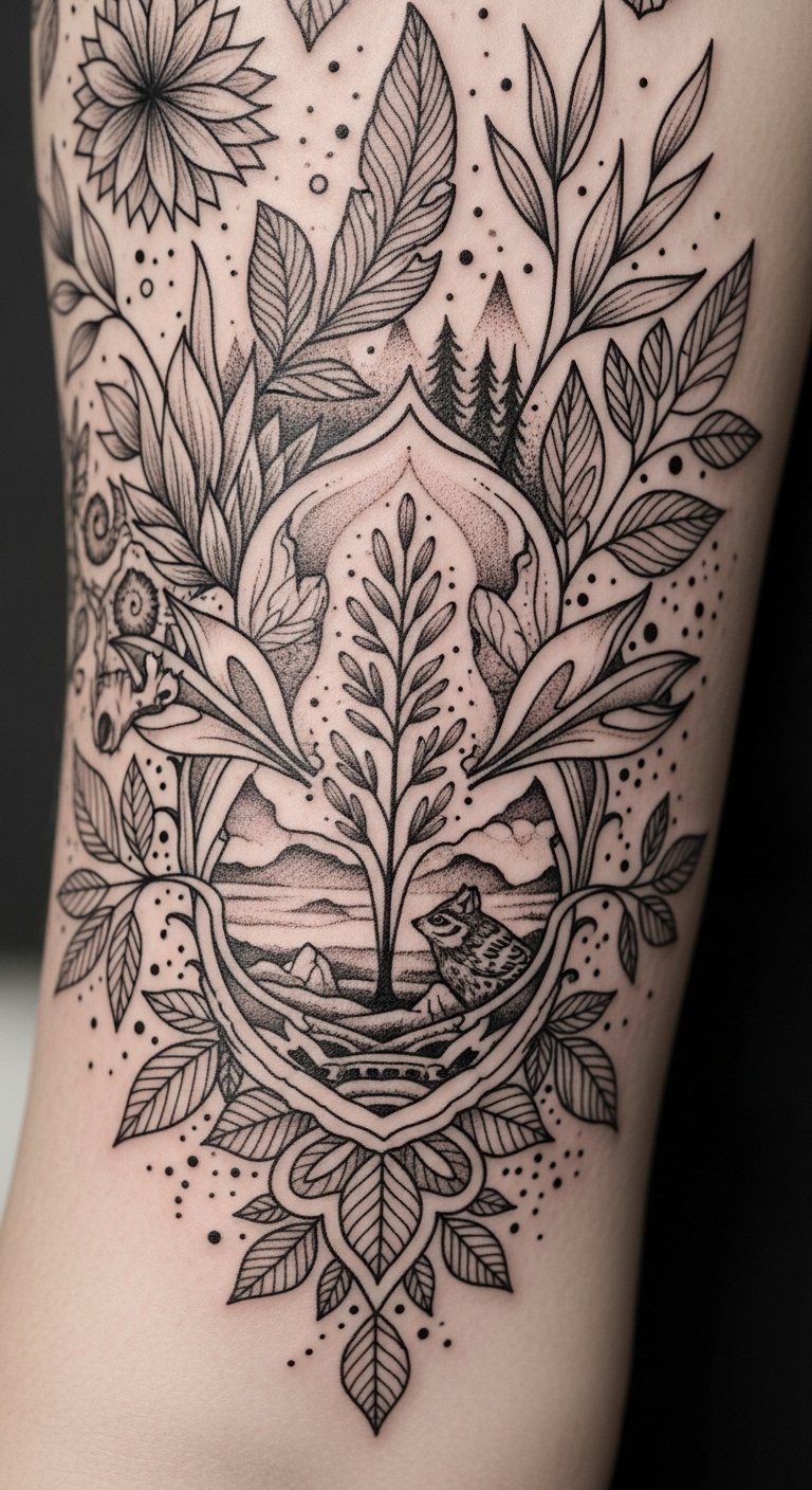 This design symbolizes a deep bond with nature—botanical elements and wildlife motifs represent growth, resilience, and the cycle of life; organic shapes and landscape silhouettes convey fluidity and openness, while eco-friendly ink emphasizes respect for the environment.