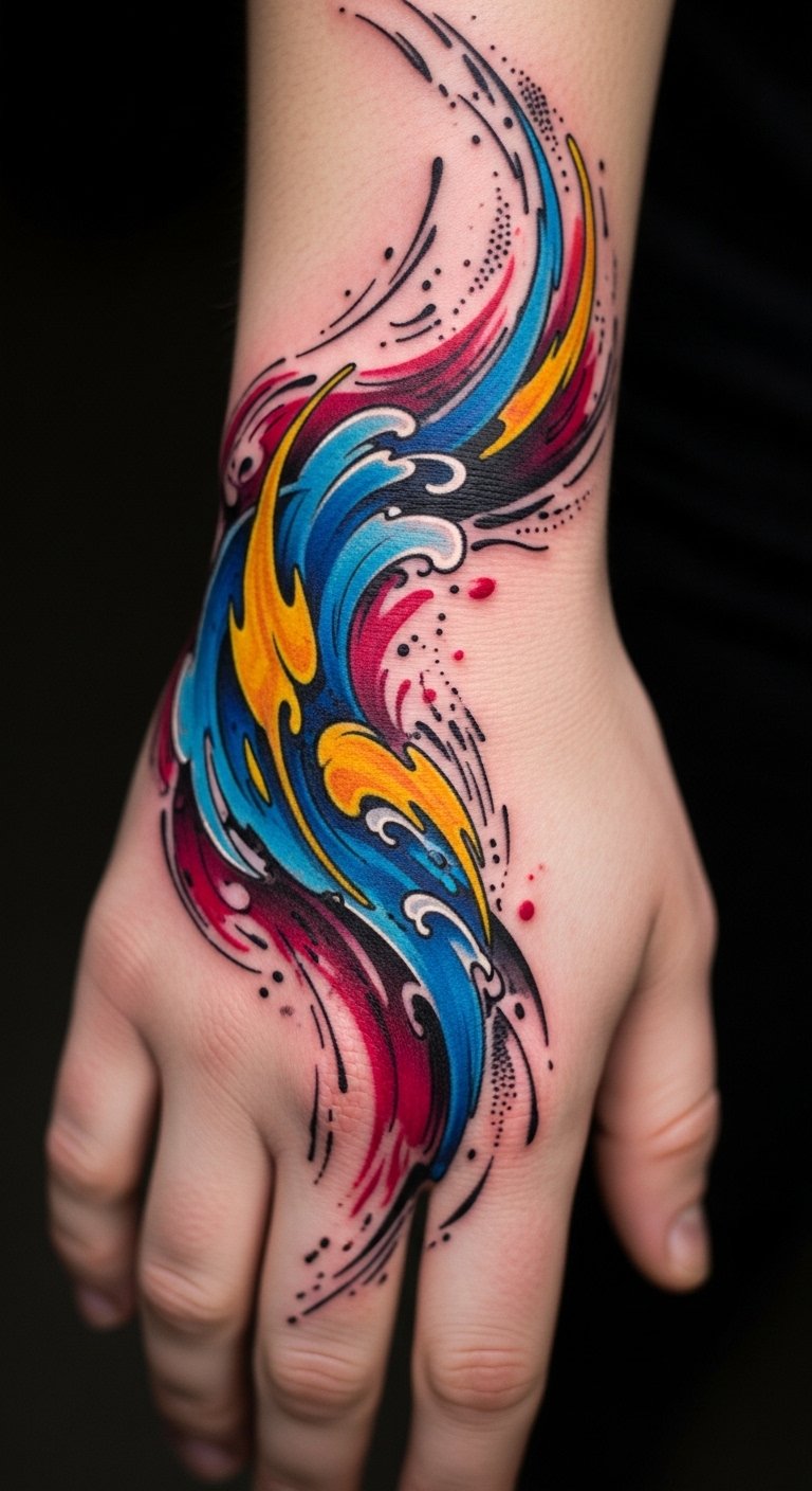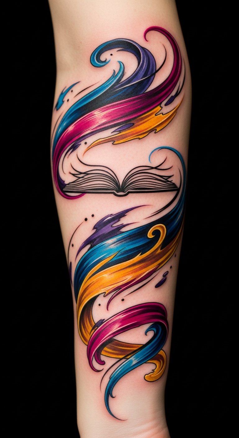 This design channels the energy of storytelling and painterly motion—an open-book motif that dissolves into expressive color symbolizes narrative turning into feeling; placement on the forearm wraps the tale into daily visibility for confidence, the shoulder blade allows private reflection and broad movement, and the ribcage cascade offers an intimate, emotive keeper of personal history.