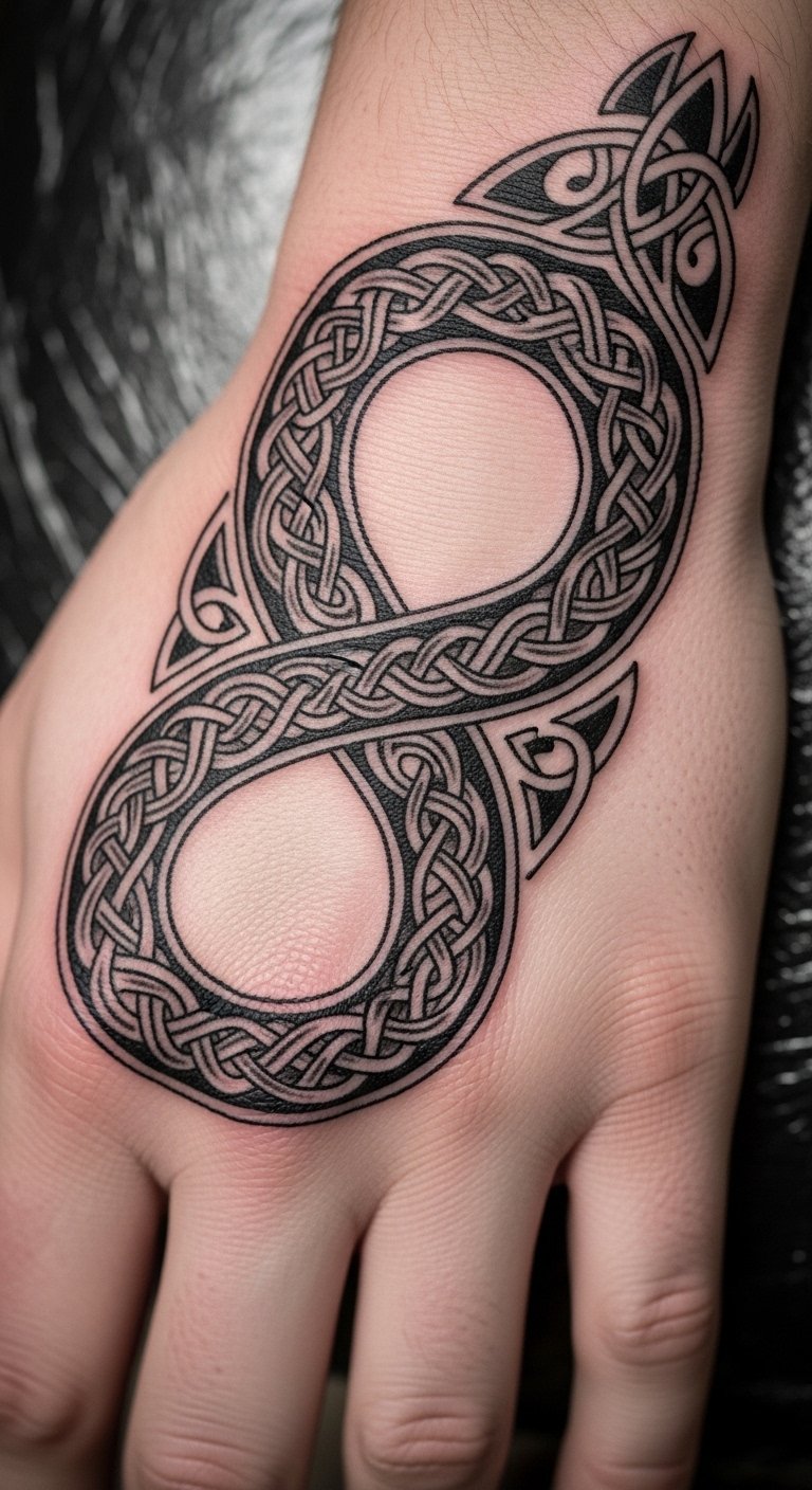 Celtic knotwork here symbolizes unbroken continuity and the interweaving of past and present; placing the piece on the side of the hand keeps the design visible yet intimate, allowing the wearer to convey personal heritage and resilience through gentle movement.