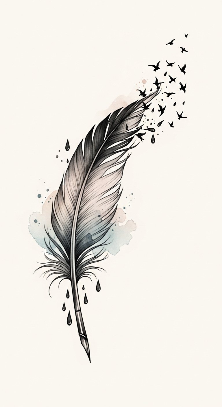 This design emphasizes the transition from written thought to liberated spirit—the quill grounding the piece in intent while the feather and birds suggest release and movement.