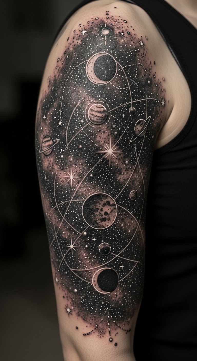 Stars and celestial bodies text becomes a minimalist yet detailed tattoo concept: a sweeping crescent horizon with scattered tiny stars and a few larger, softly glowing points connected by faint geometric lines to suggest “cosmic alignments.”