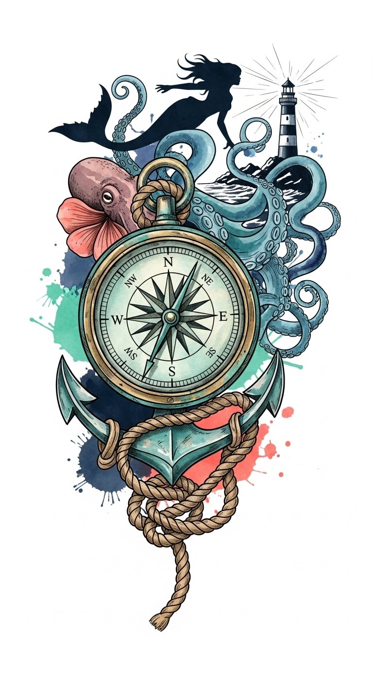 This design weaves those elements into a cohesive scene where the compass and anchor symbolize guidance and steadiness, the mermaid and octopus represent mystery and adaptability, and the lighthouse offers hope; emotionally it balances wanderlust with security.