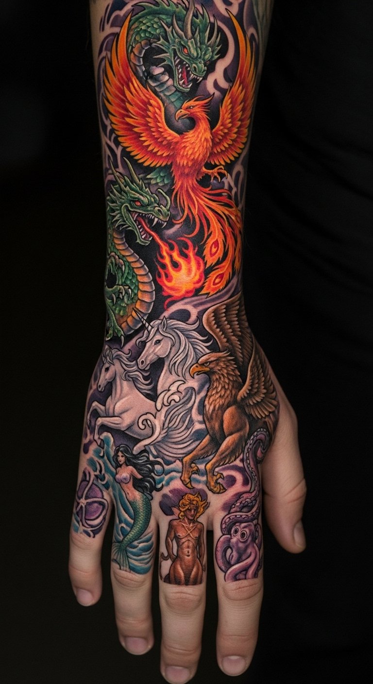 A sweeping sleeve-inspired side-hand tattoo that arranges these creatures into a flowing tableau: a sinuous dragon curling toward a rising phoenix, a delicate unicorn and proud griffin facing one another, a mermaid entwined with kraken tentacles, and a centaur poised beneath them all; rendered in a mix of fine-line detail and watercolor splashes with selective gold accents. Symbolically this composition balances rebirth (phoenix), courage and ferocity (dragon, griffin), purity and wonder (unicorn), mystery and depth (mermaid, kraken), and grounded strength (centaur). Emotionally it evokes transformation, protection, and freedom; placed along the side of the hand extending up the forearm and wrapping slightly onto the wrist, it reads as a continuous narrative visible in motion yet intimate when at rest.