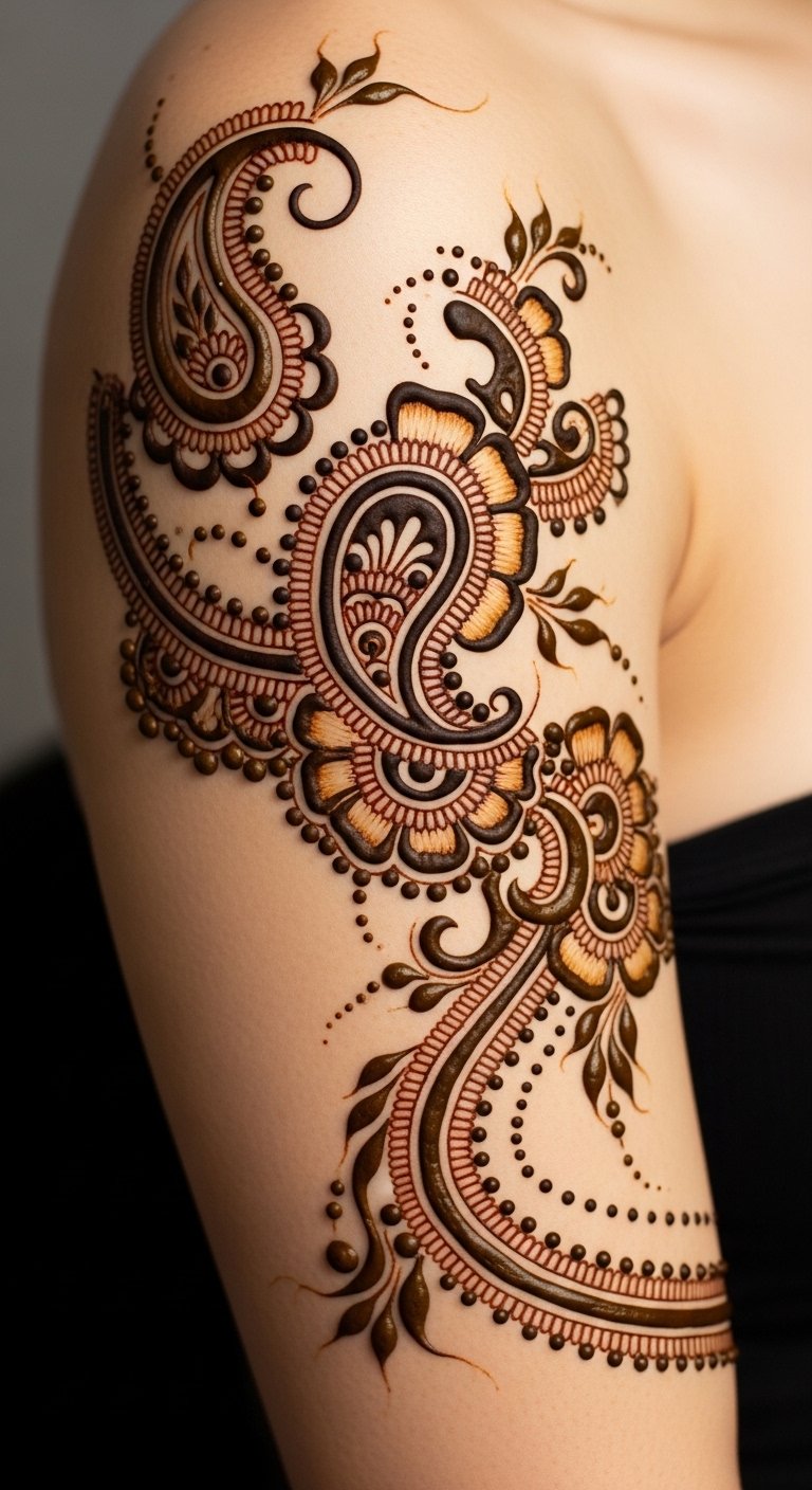 Designed to wrap from wrist to shoulder, the motifs symbolize growth (vines), protection (mandala centers), and celebration (floral clusters). The warm tones and lace-like edges evoke intimacy and heritage; ideal placement follows natural contours for movement and visibility, inspiring calm pride and connection.