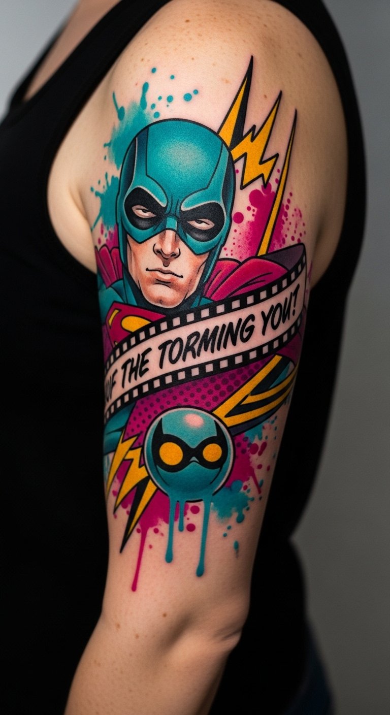 This design uses superhero imagery to evoke strength and aspiration, nostalgic cartoon motifs to tap into warmth and personal history, and a film-quote ribbon to anchor a chosen belief or memory; the bold colors and comic linework create excitement and visibility while watercolor splashes add emotional softness. Placed on the mid-upper arm, the piece reads as a confident statement when visible and a personal talisman when covered; fine dotwork and negative space maintain skin breathability and longevity, encouraging both celebration and introspection.