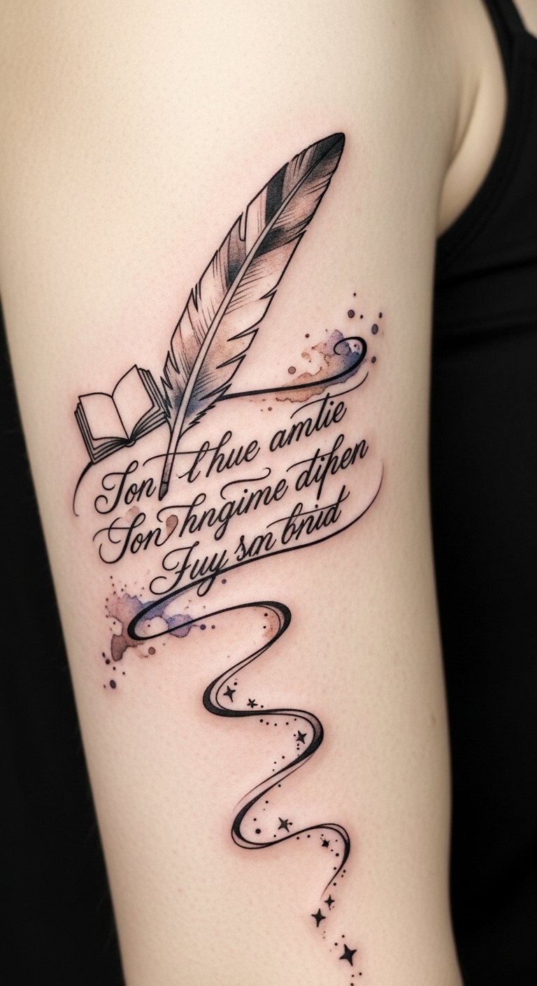 Watercolor smudges evoke memory and emotion, while fine script keeps the phrase intimate and readable. Ideal placements—forearm, ribcage, collarbone—allow the wearer to reveal or conceal the line as desired, reflecting personal connection and the quiet pride in carrying literary wisdom on the skin.