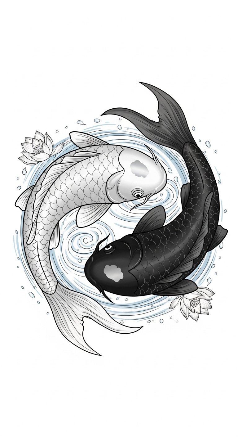 The koi fish motif deepens the emotional resonance—persistence and transformation swimming in eternal balance—while the circular composition emphasizes continuity; ideal placements are forearm or upper back where the motion can flow with the body’s lines, invoking calm strength and reflective equilibrium.