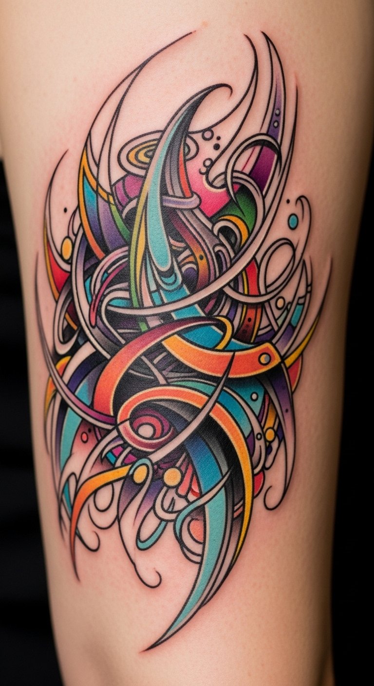 A flowing composition that translates the original text into interlocking abstract motifs: sweeping brushstroke lines, fragmented geometric shapes, and soft watercolor washes forming a vertical column for the forearm or along the ribcage. Use a limited palette of deep indigo, warm ochre, and muted teal, with fine black linework anchoring curves and negative-space breaks that let skin show through; incorporate a subtle spiral to symbolize personal narrative and a few feathered strokes for freedom. This design evokes liberation, creativity, and identity—place it where movement and visibility emphasize the story: outer forearm, side torso, or calf.