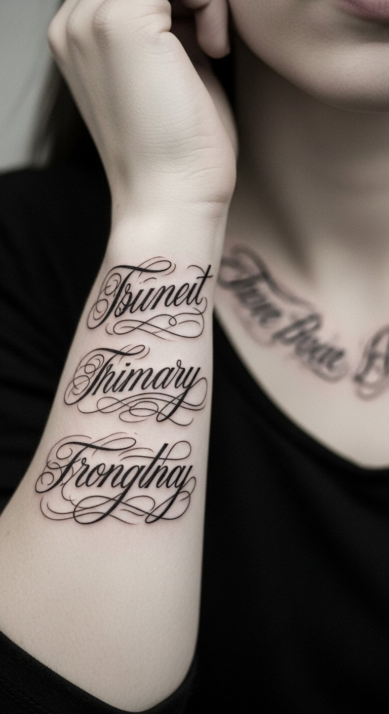 This design concept uses the interplay of old-world letterforms and modern minimalism to symbolize the continuity between past and present in your personal narrative; emotionally it aims to feel intimate and contemplative, suited for placements like the inner forearm, collarbone, or along the ribs where the script can follow natural curves and be shared selectively.
