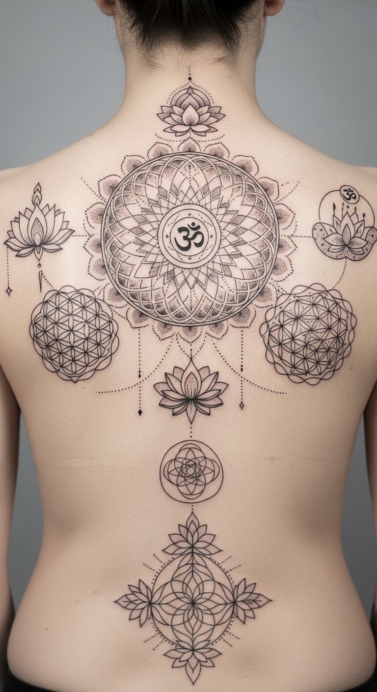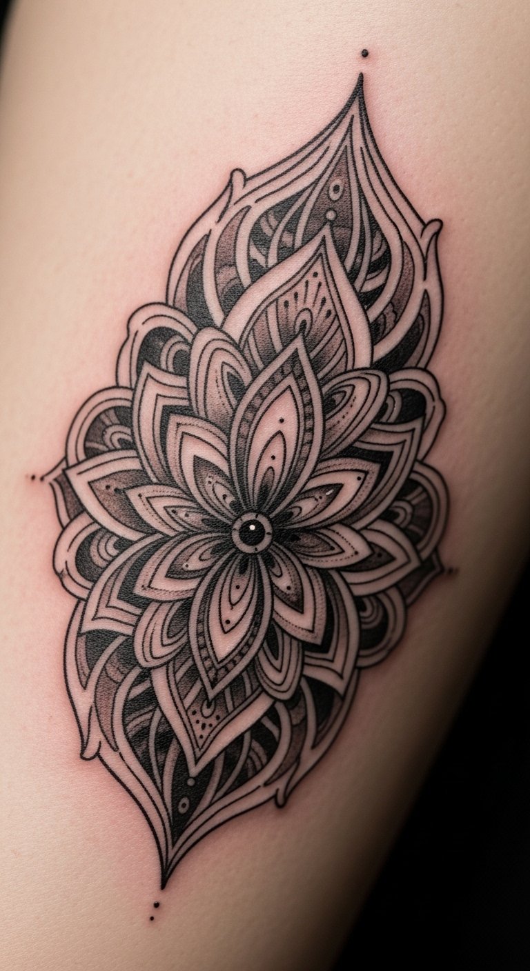 Place this design along the forearm or upper back for visibility and flow; it symbolizes balance through symmetry, evokes calm focus through meticulous detail, and conveys personal freedom via open negative spaces, inviting contemplative connection and confident self-expression.