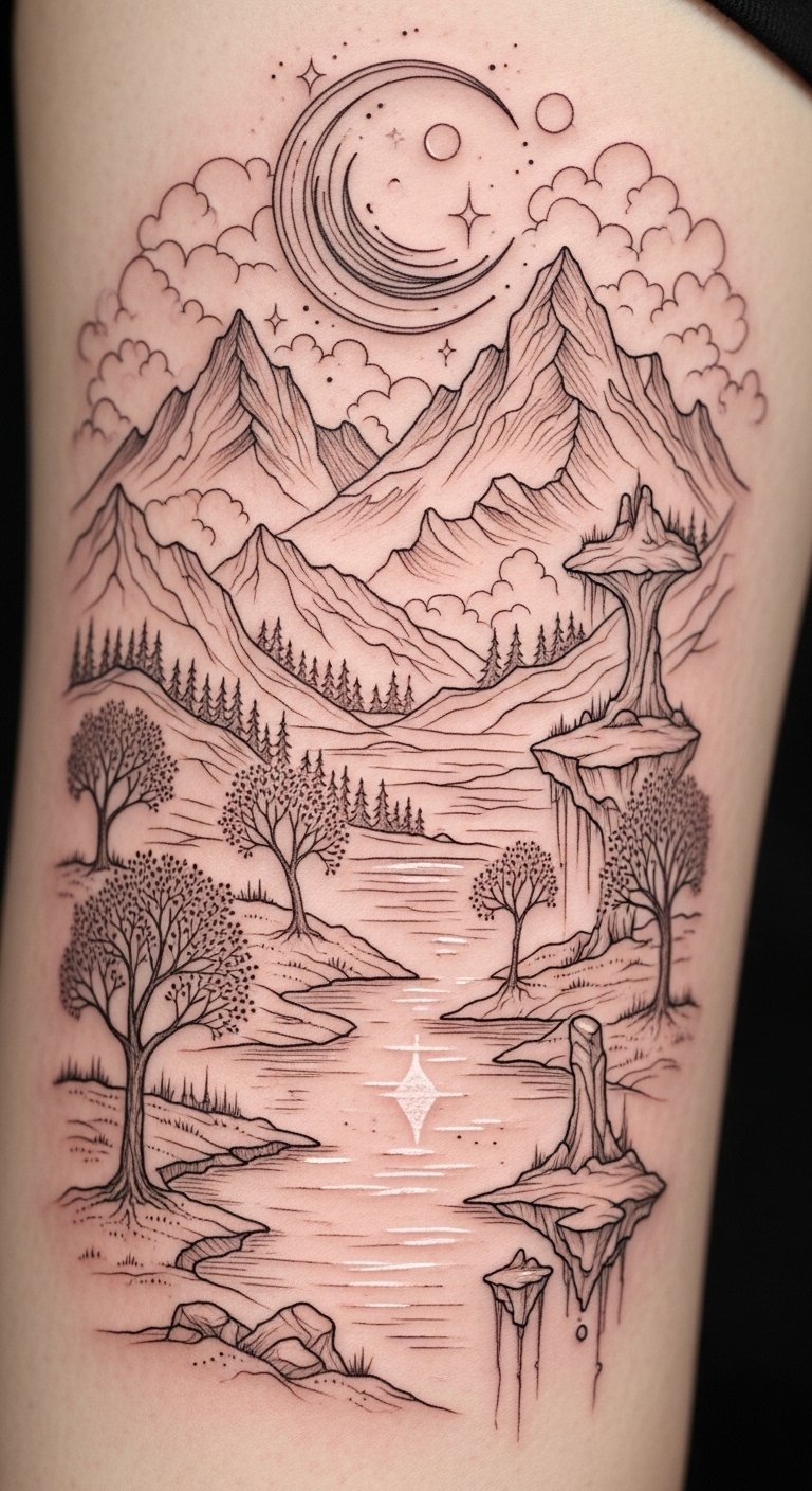 This design concept channels the delicate, otherworldly mood of the text into a slender single-needle composition: a continuous micro-line scene wrapping gently along the forearm or ribcage, starting with a tiny celestial mountain silhouette at one end that transitions into a misty valley with minute trees and a glassy lake, finished with faint horizon stars at the opposite tip. Symbolically it represents an inner journey between reality and imagination, evoking calm, wonder, and liberation; placement on the forearm offers visibility and daily reminder, while the ribcage provides a more intimate, private connection to the wearer’s inner landscape.